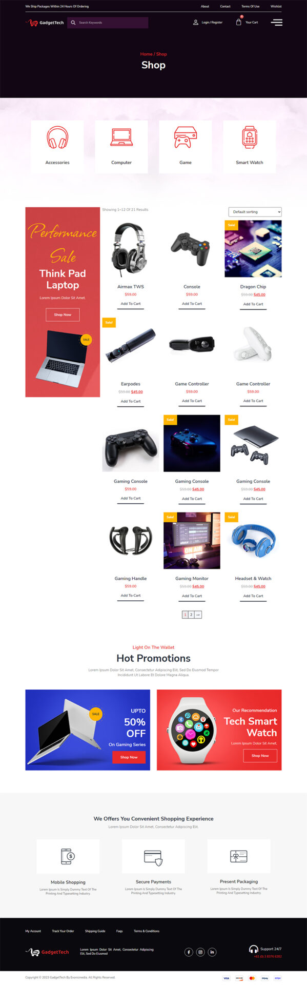 GadgetTech Elementor template kit is a set of pre-designed templates for building an online store for technology products. It is built to use with elementor and you can easily customize it. The kit includes different types of pages that an e-commerce website may need, like homepage, product pages, blog page and a cart page.