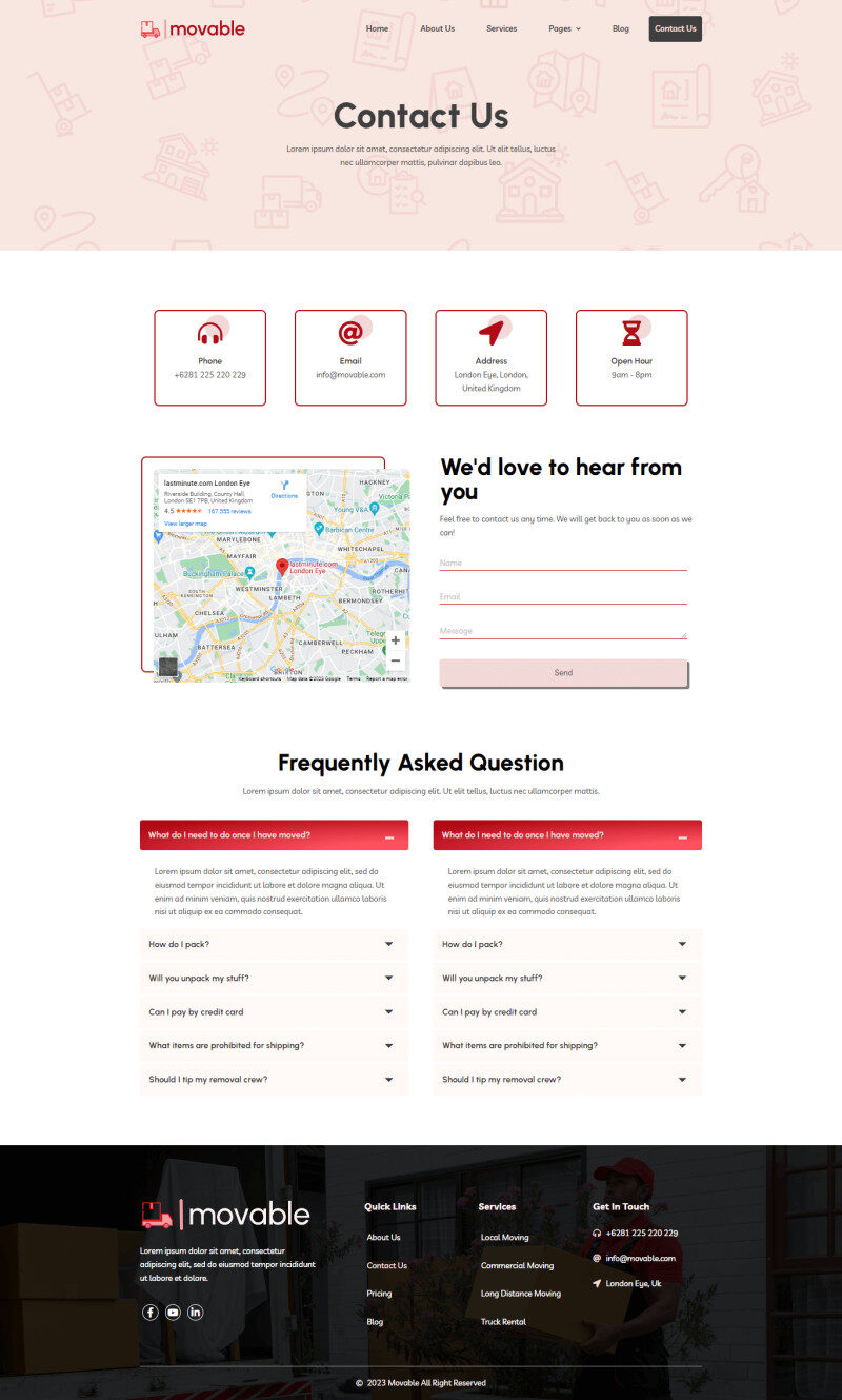Movable is an Elementor template kit for local moving, long distance moving, commercial moving services and truck rental. Movable uses free elements, so don’t worry about trying this one. Movable provides various pages including Home, About Us, Team, Services, Services Detail, Pricing, Blog, Single Blog, 404, Contact Us.